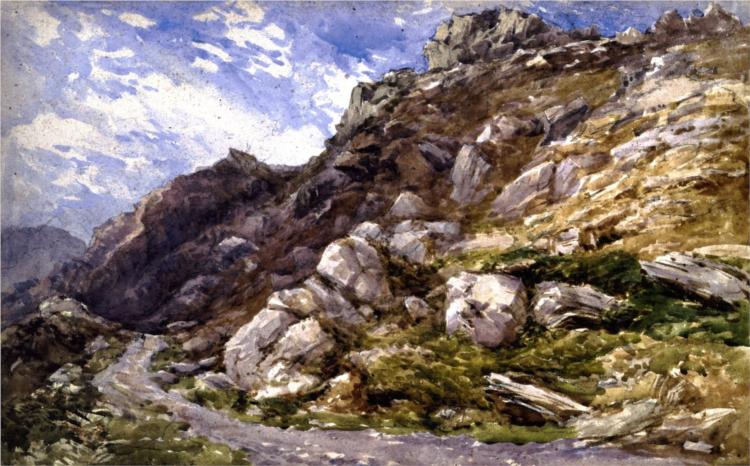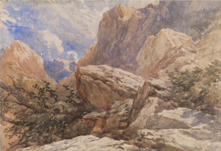 Souvent représentés dans un paysage montagneux, marin, au gré de l’envie du peintre, David Cox avait une technique particulière pour faire ressortir les rochers. D’un style plutôt libre et vivant, cet aquarelliste peignait souvent sur un papier rugueux et très absorbant, légèrement teinté. Par sa touche vigoureuse, il accentuait la texture rêche des rochers comme dans ces toiles ci-dessous.